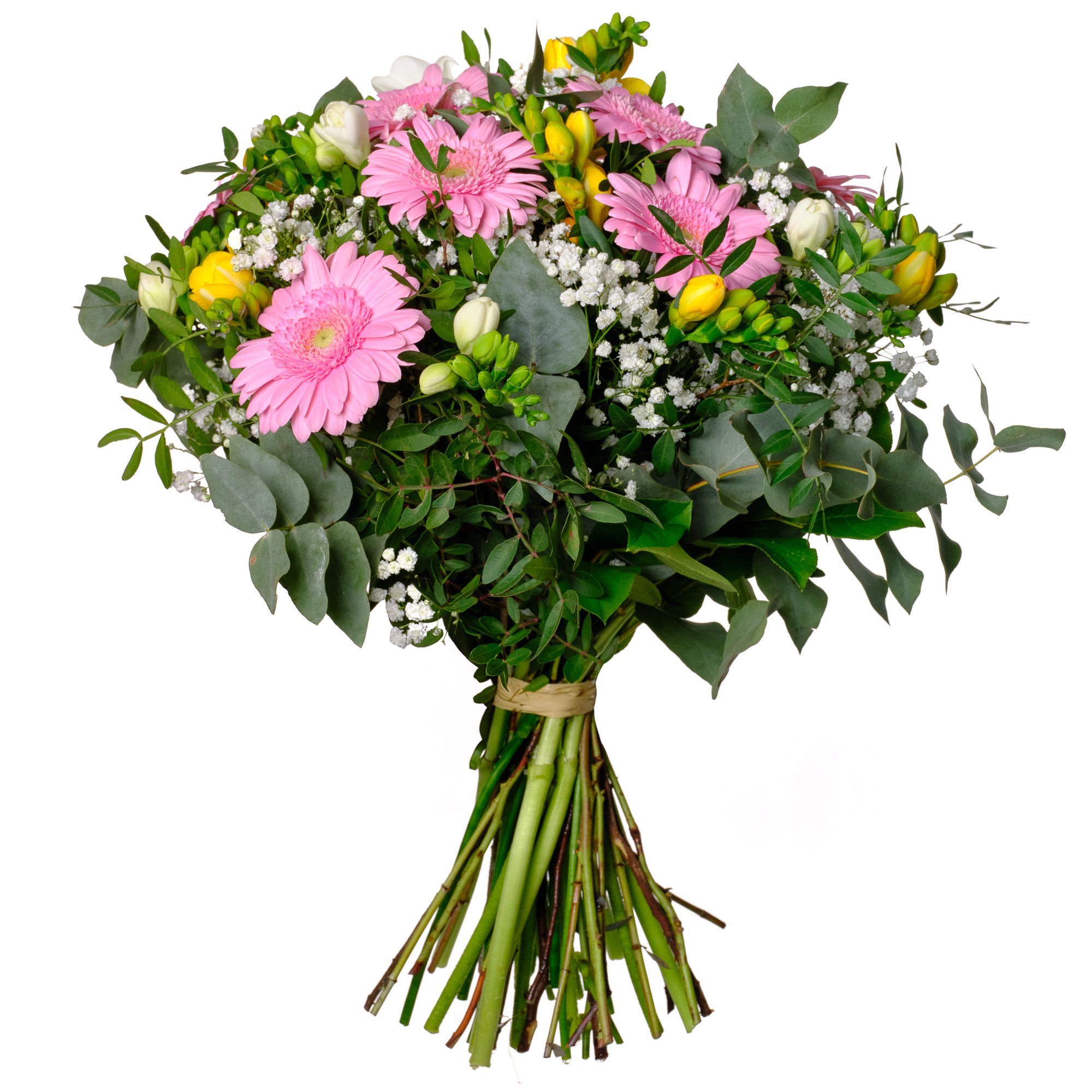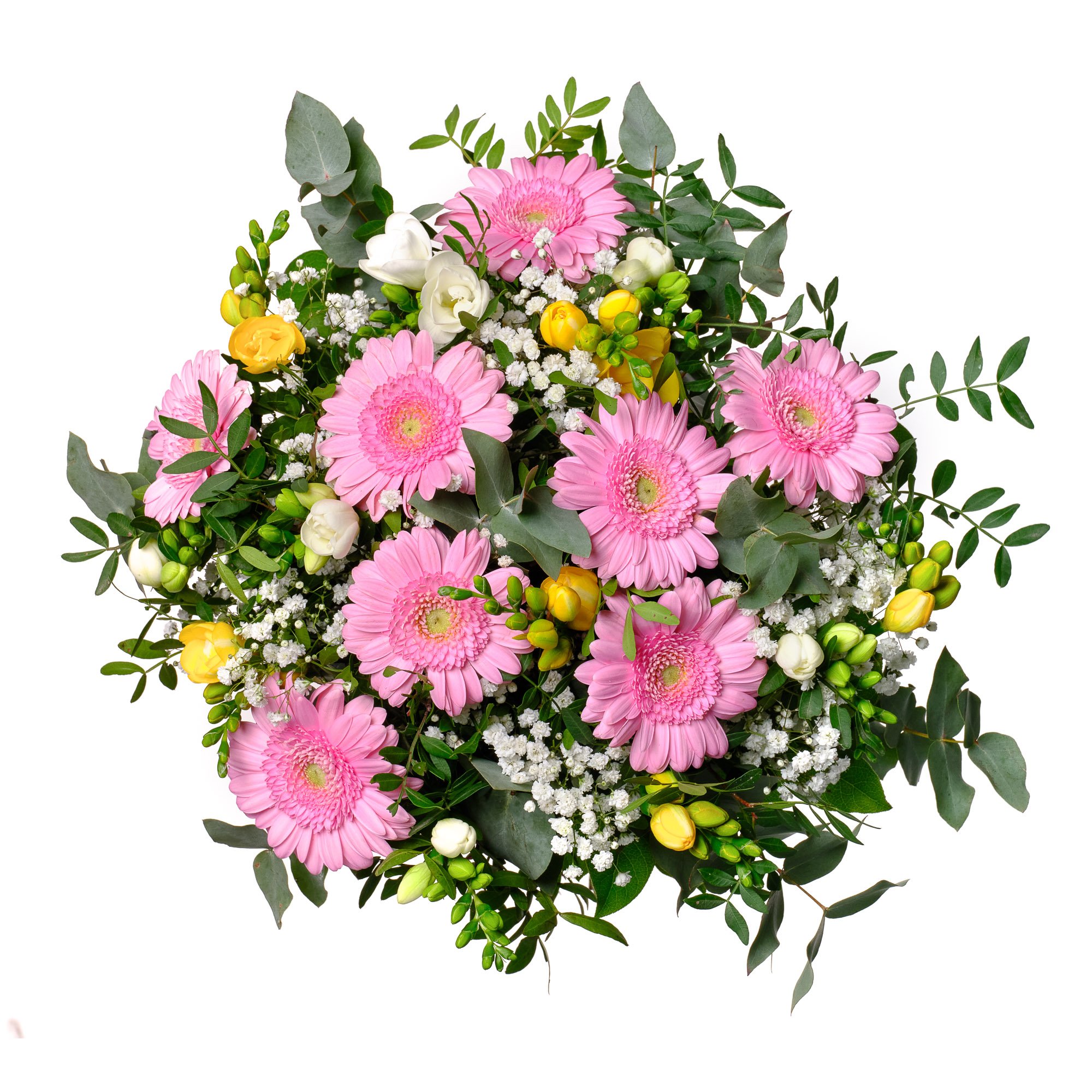 Large Mini Gerberas, Freesias, Gypsophila & Decorative greenery (18 stems)