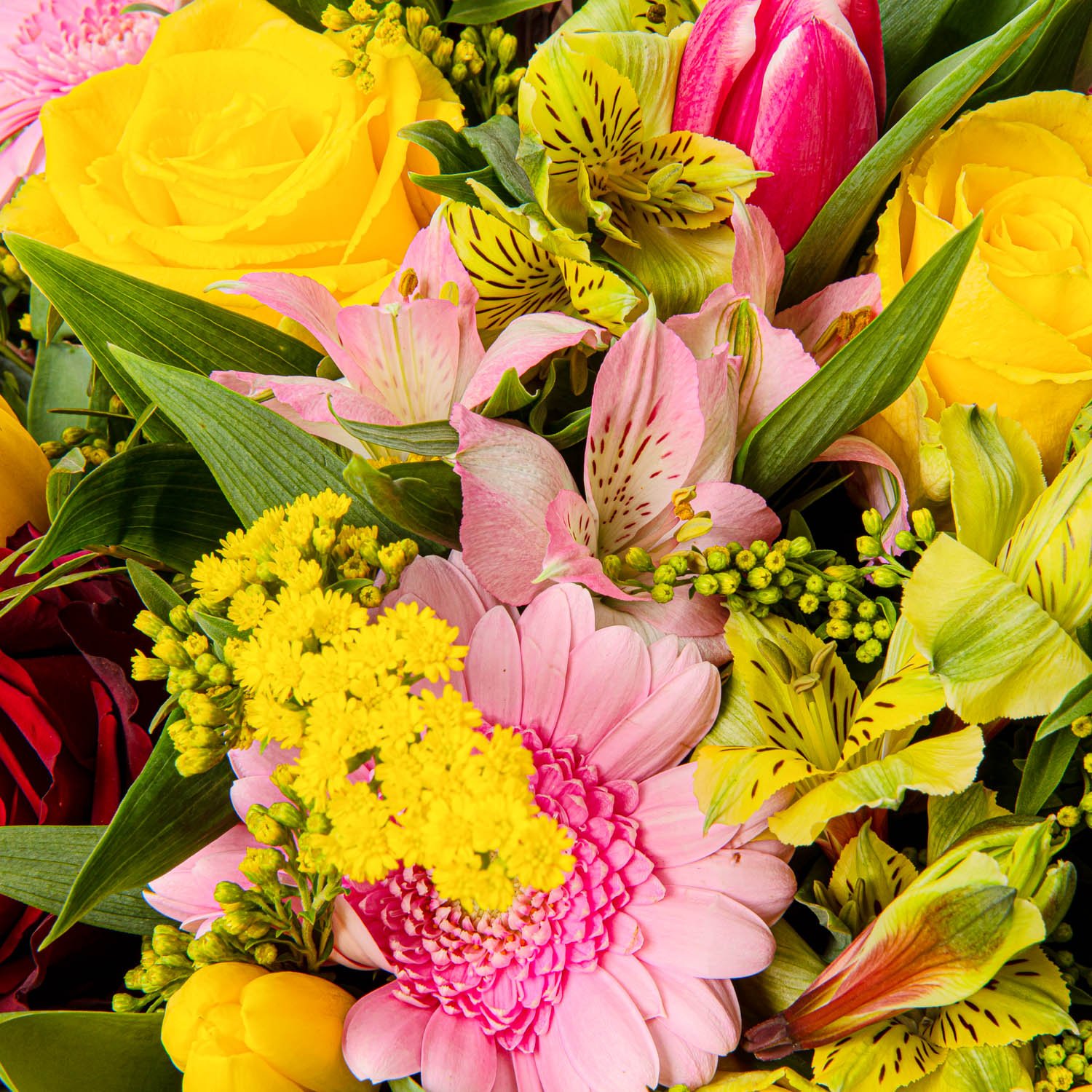 | Exclusive | Roses, Mini Gerberas, Alstroemerias, Goldenrods, Tulips & Decorative greenery (38 stems) |