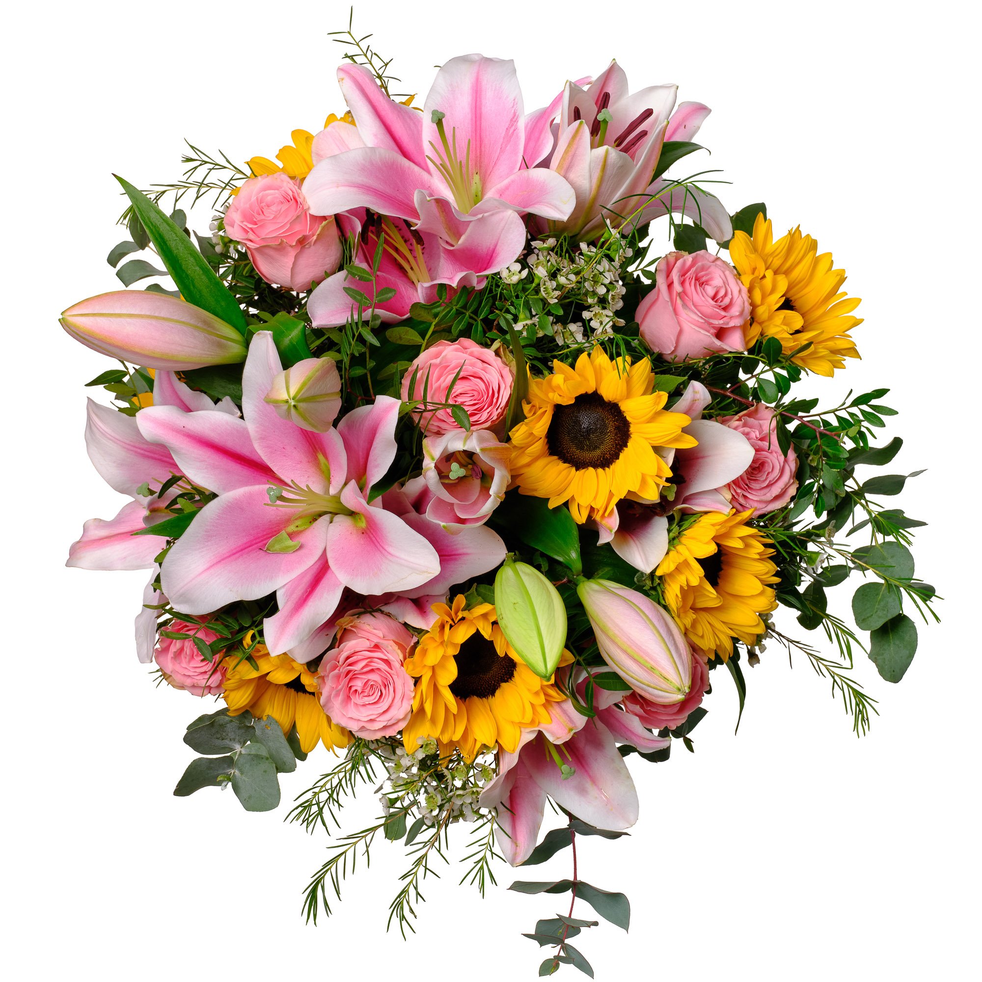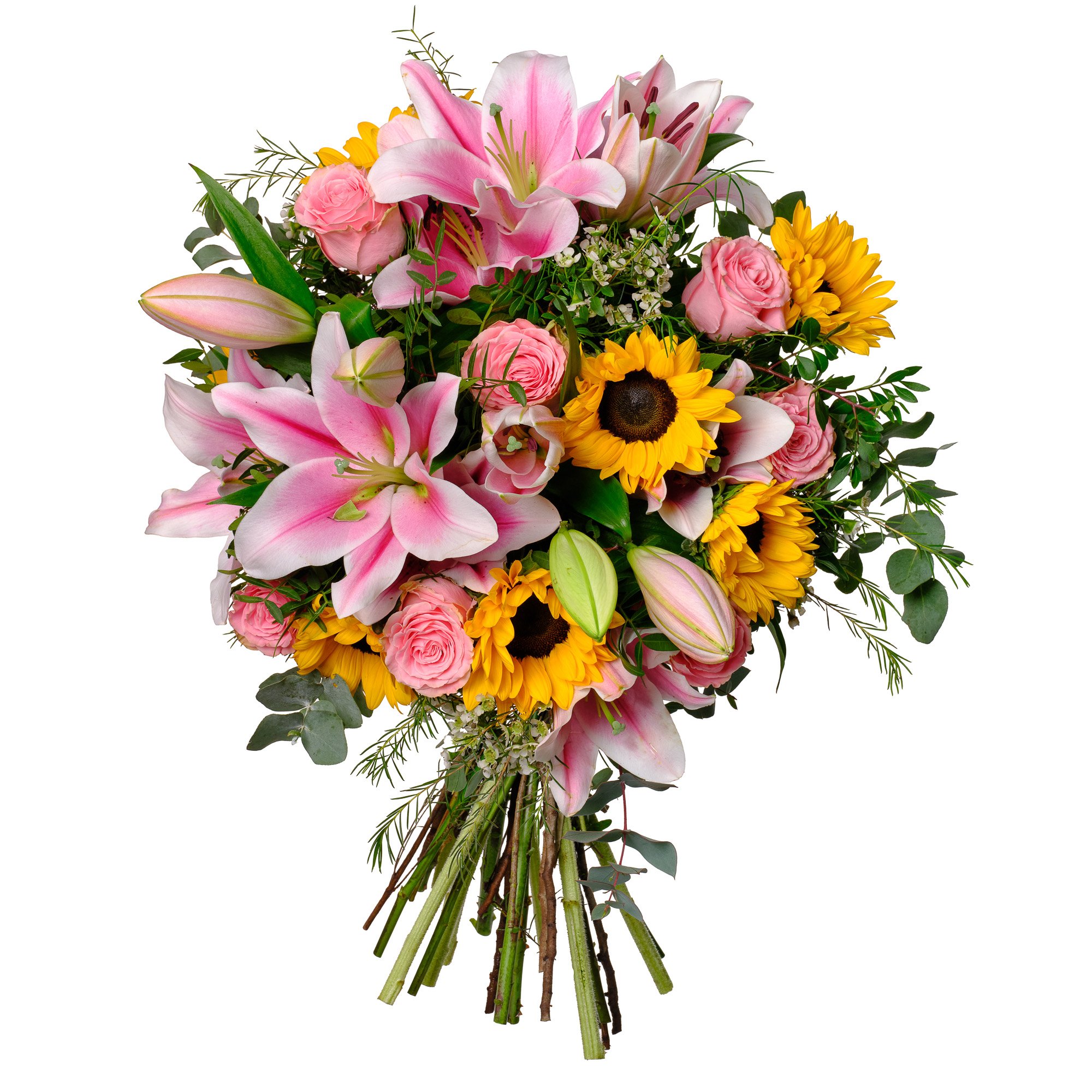 | Large | Stargazer Lilies, Sunflowers, Roses, Waxflower & Decorative greenery (15 stems) |