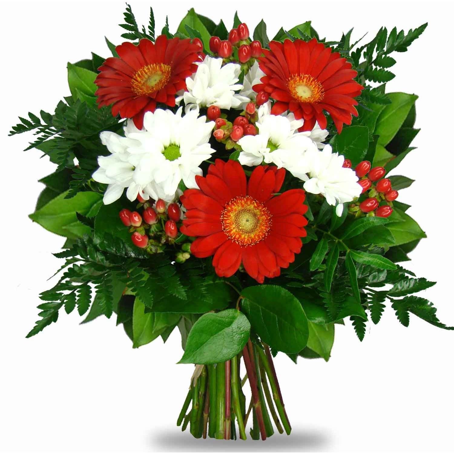 Klasický mix mini gerber a chrysantémy oživený červeným hypericem, to je kytice Nanna.