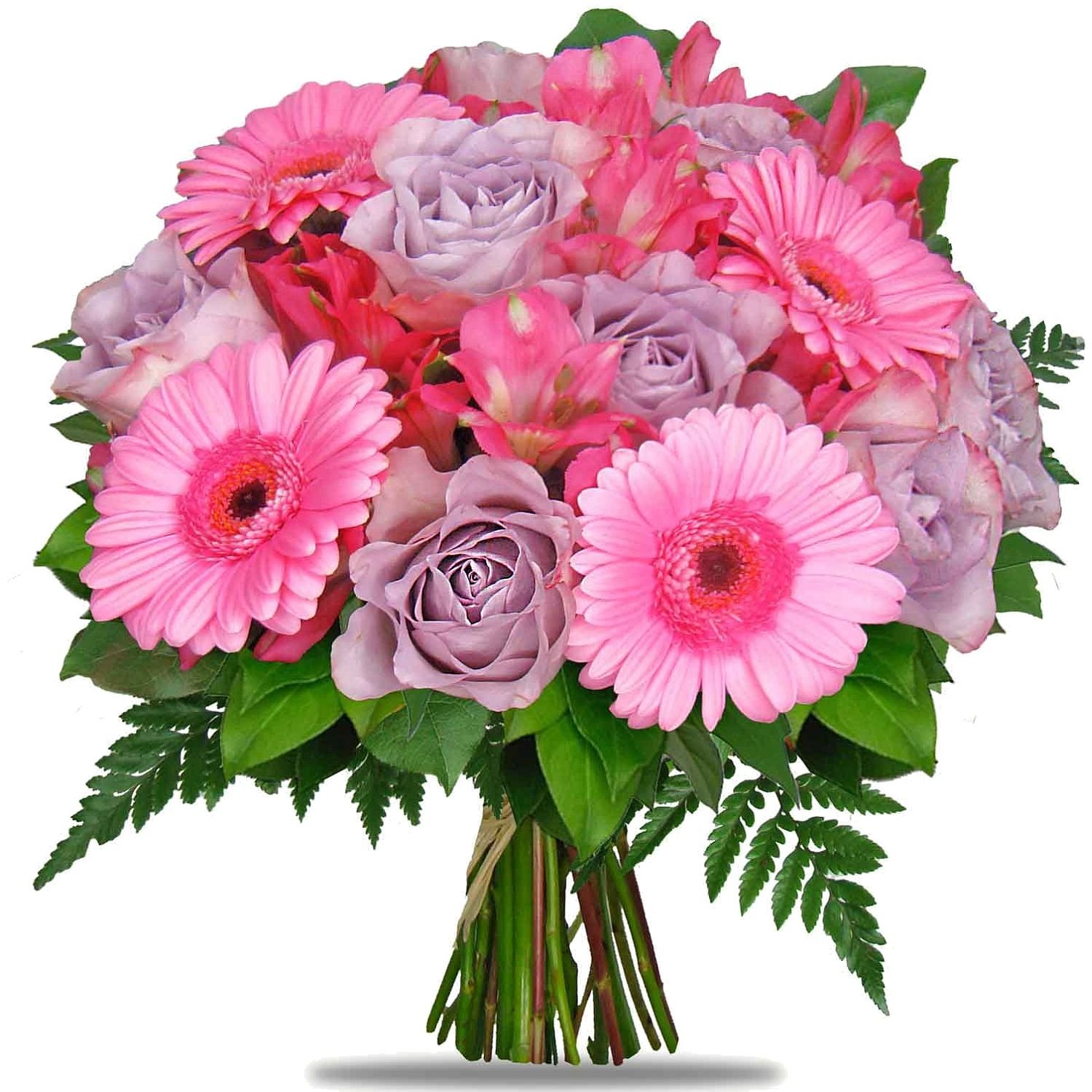 Růžový mix alstromerí, germínek a růží tvoří něžnou a romantickou kytici