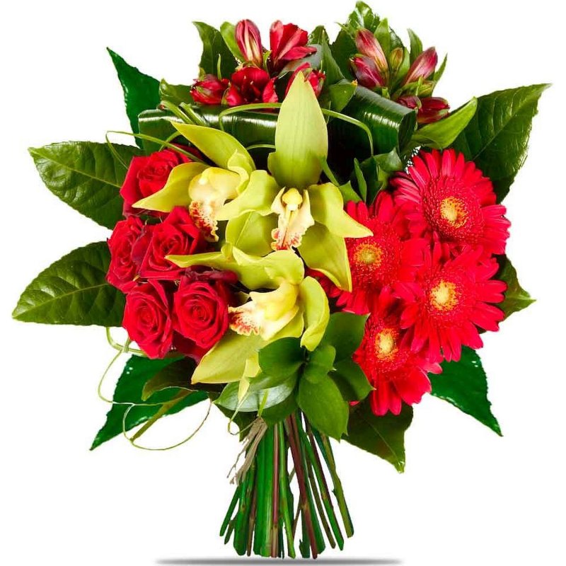 3 ks květy orchideje, 4 ks germína, 5 ks růže, 3 ks alstromerie a dekorativní zeleň (bear grass, aspidistra, aralie)