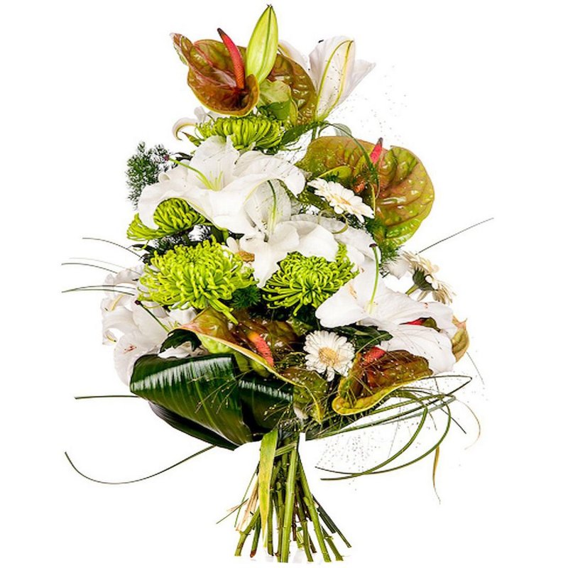 | Exkluzivní | 4 ks Anthurie, 5 ks Germína, 5 ks Lilie SG, 5 ks jednokvětá chrysantéma a dekorativní zeleň (aspidistra, bear grass, pistacie) |