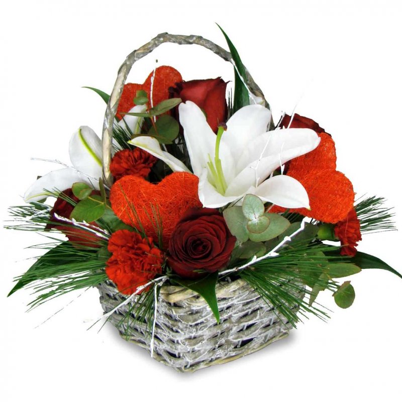 1 ks královská lilie, 5 ks růže, 3 ks karafiát, 3 ks dekorativní srdce, proutěný koš, eucalyptus a dekorativní zeleň