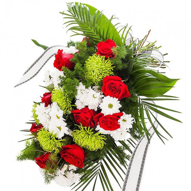 Smuteční kytice složená z rudých růží a dvou druhů chrysantémy doplněná bohatou zelení je vázaná postupně, hodí se tedy i na položení v obřadní síni či na hrob. Citlivě a beze slov lze vyjádřit soustrast pozůstalým. Na stuhu lze přidat text dle vašeho přání.