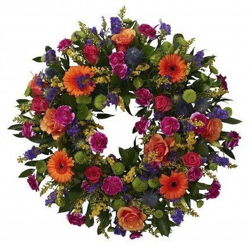 | Standardní | 4 ks gerbera mini, 5 ks růže, 5 ks santini, 5 ks trsový karafiát, 4 ks limonium, 4 ks solidago, 3 ks eryngium, smuteční stuha a dekorativní zeleň. Velikost cca. Ø 50 cm |