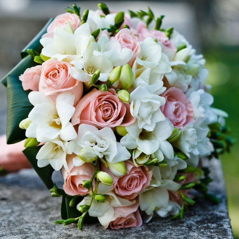 Svatební kytice Emma kombinuje romantické růžové růže s elegantními fréziemi. Klasický kulatý tvar, barevnost i květinové složení z ní dělají jednu z nejoblíbenějších svatebních kytic. Manžetu tvoří lesklé listy aspidistry a stonky jsou ovázané saténovou stuhou. Dostupná ve všech ročních obdobích a různých barevných variantách.