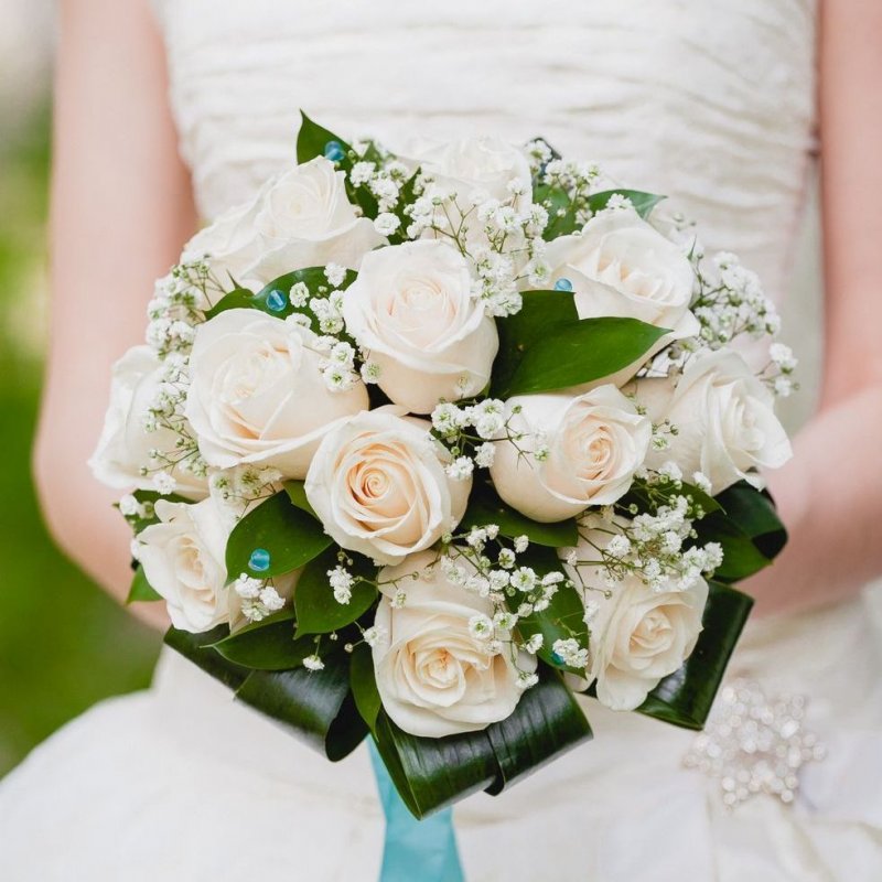 Svatební kytici Madelyn vévodí krémové růže. Společně s modrými perličkami, jemným nevěstinným závojem a decentní zelení patří mezi oblíbené kompozice. Svatební kytice, která je vhodná pro každé roční období.