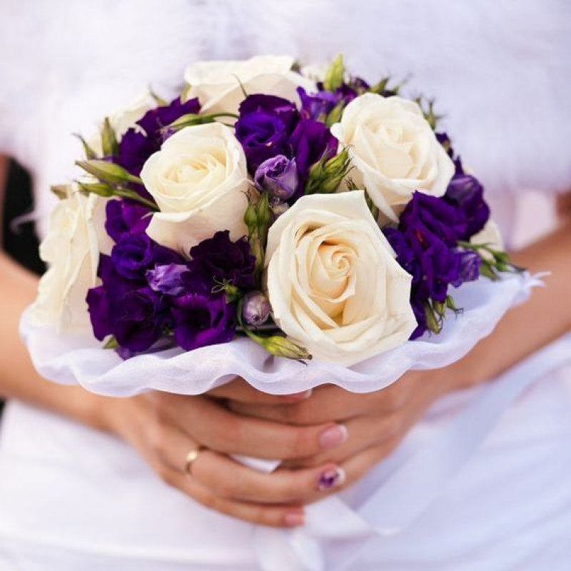 Kontrast mezi fialovou eustomou a bílou růží tvoří základ svatební kytice Zoe. Vše je podtrženo jemnou bílou organzou. Vhodná volba v každém ročním období.