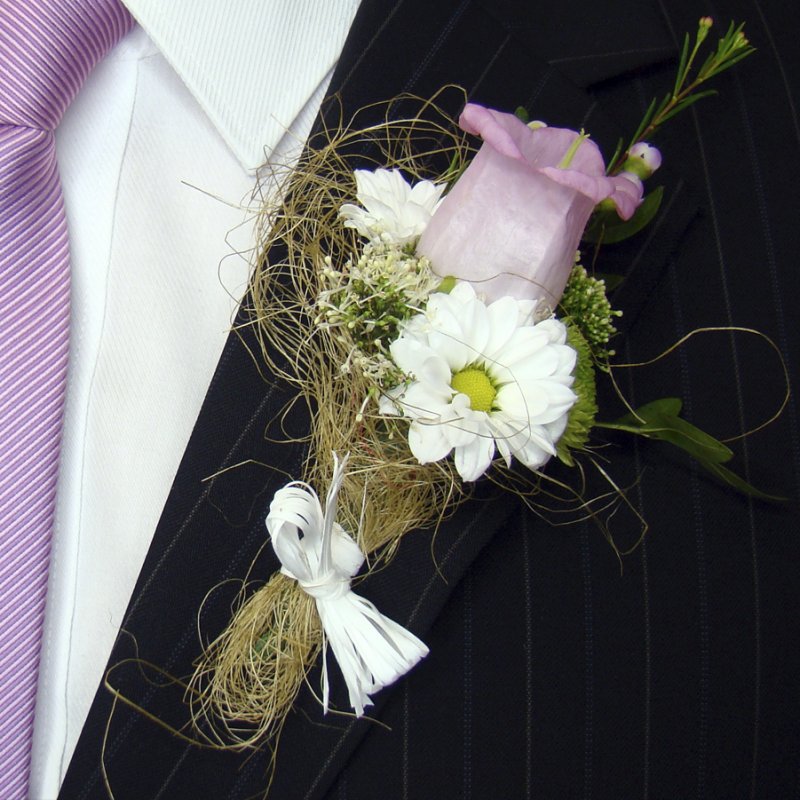 Korsáž Henry v rustikálním stylu složená z květu zvonku a chrysanthém sanitni. Venkovský nádech dodává zdobení přírodním sisalem a jednoduchá stužka.
