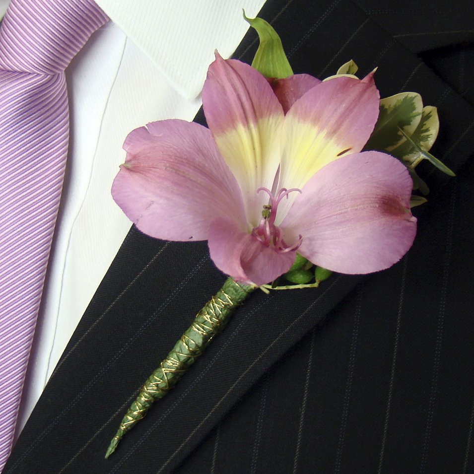 Květ alstromerie doplněný jemnou zelení, to je elegantní korsáž Isaac.