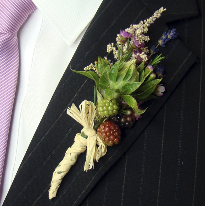 Luční květy a ostružiny v korsáži Max perfektně sednou k letním rustikálním svatbám.