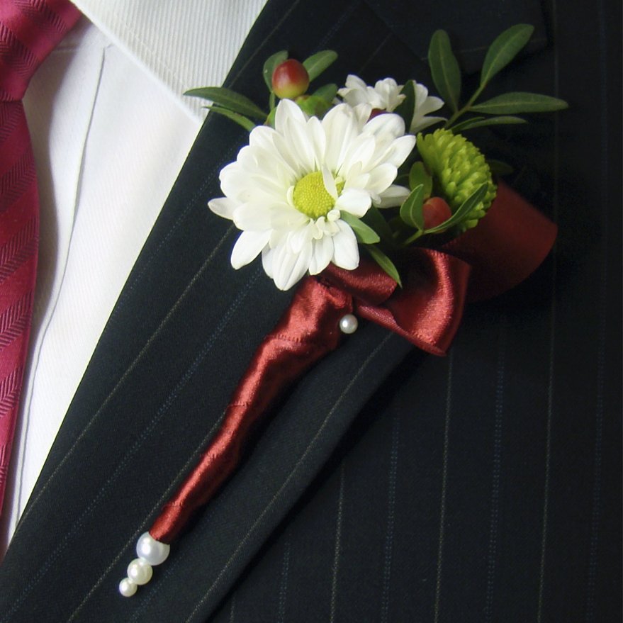 Květ bílé a zelené chrysanthémy doplněný kuličkami hyperica s jednoduchou zelení. Styl korsáži Noah dodává saténová bordó stužka a perličky.