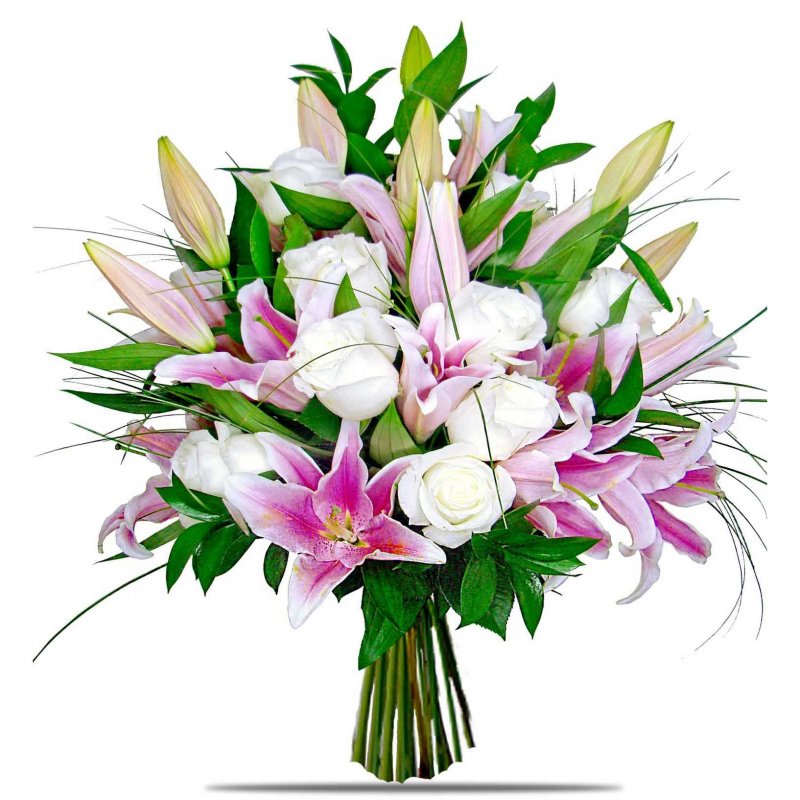 Bílo-růžová kombinace královských lilií a růží vázaná postupně tak, aby vynikla elegance jednotlivých květů.