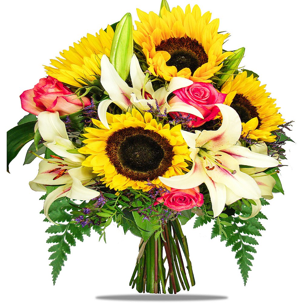 | Standardní | 1 ks královská lilie, 3 ks slunečnice, 3 ks růže, 2 ks limonium a dekorativní sezónní zeleň (pistacie, rumora) |