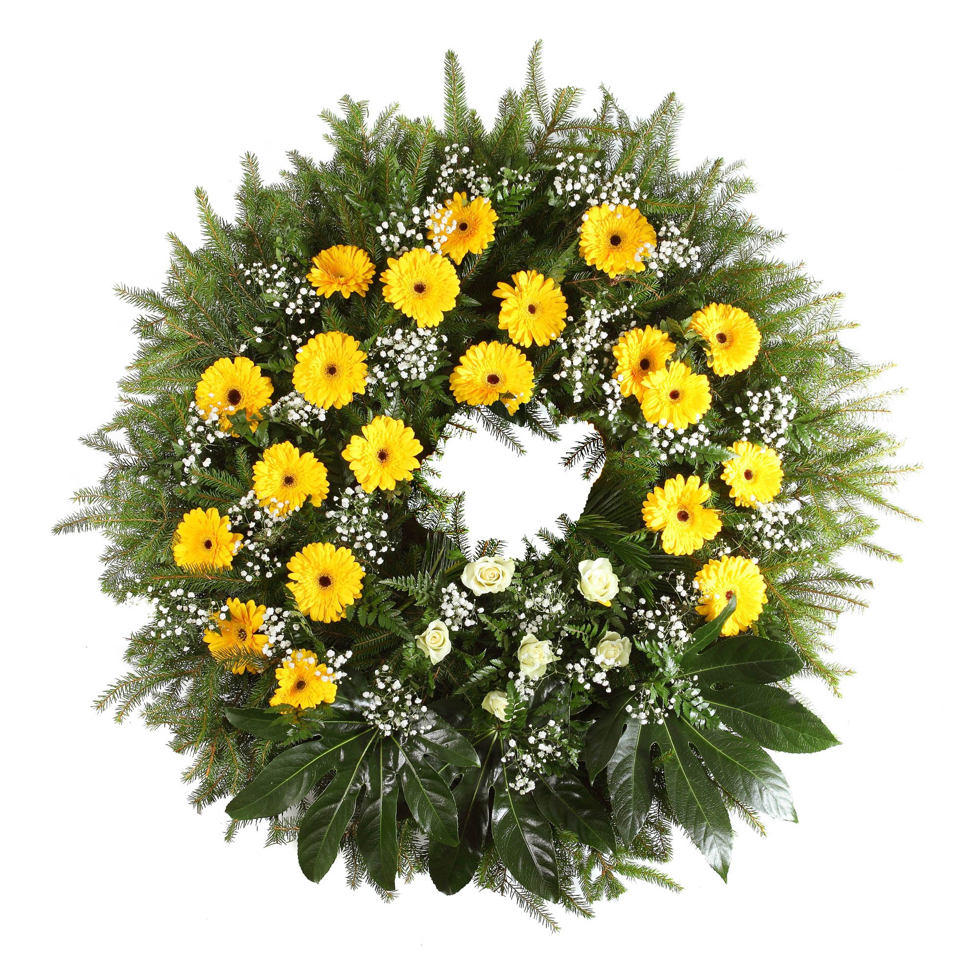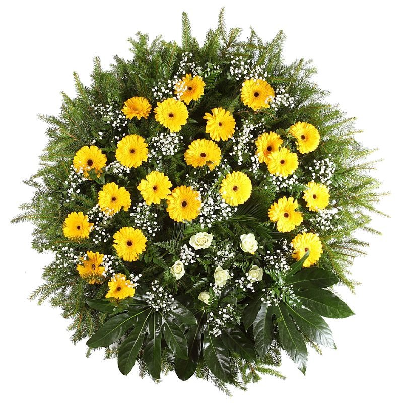 | Exkluzivní | 22 ks gerbera mini, 6 ks růže, 8 ks gypsophila, dekorativní zeleň a smuteční stuha. Velikost cca. Ø 80 cm |