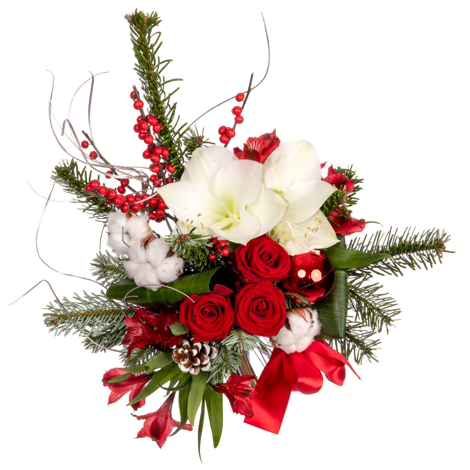 1 ks amarylis, 1 ks ilex, 2 ks alstromerie, 3 ks růže, 3 ks bavlník, mašle, vánoční dekorace a dekorativní zeleň