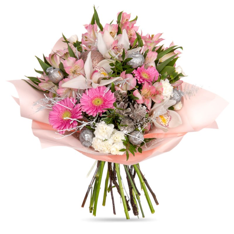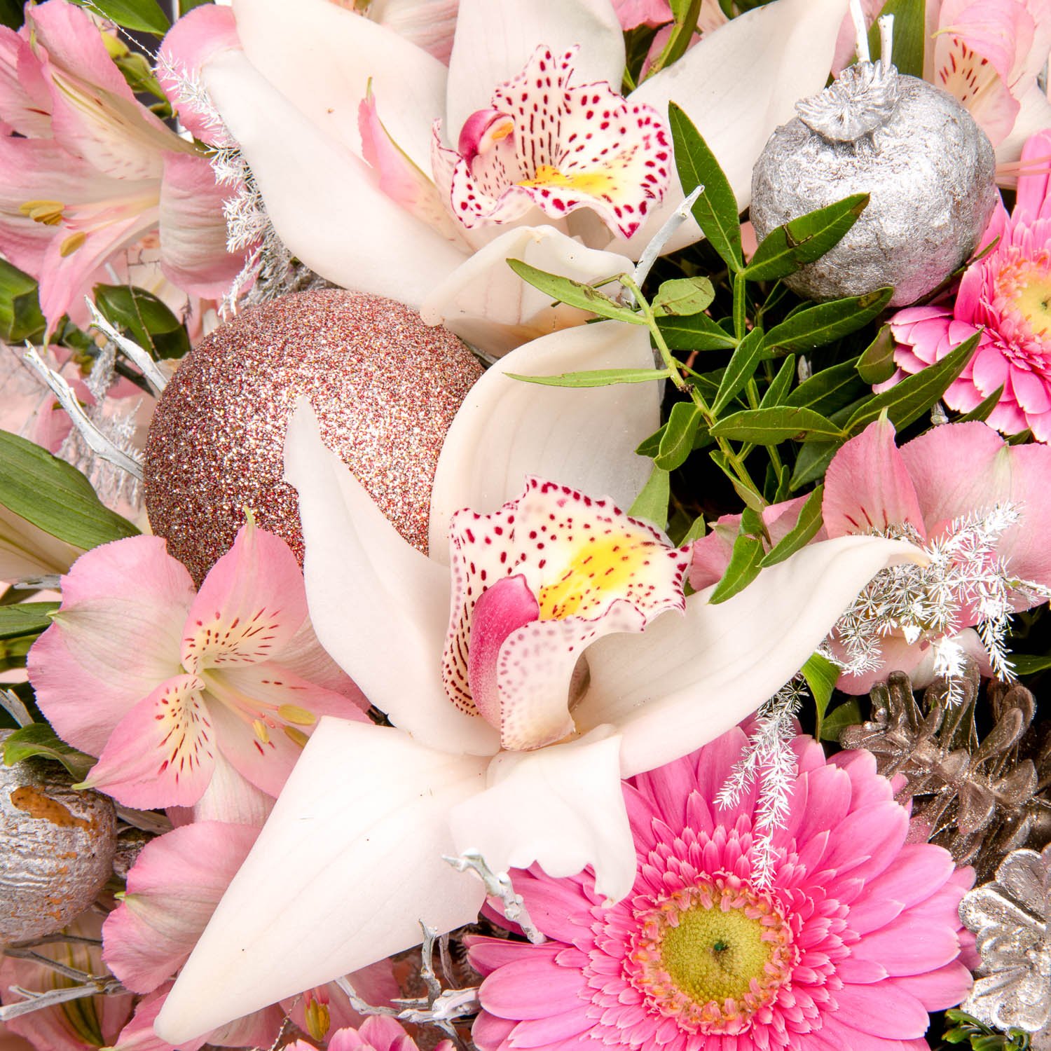 3 ks květy orchideje, 3 ks trsový karafiát, 4 ks alstromerie, 3 ks gerbera mini, mašle, manžeta, vánoční dekorace a dekorativní zeleň