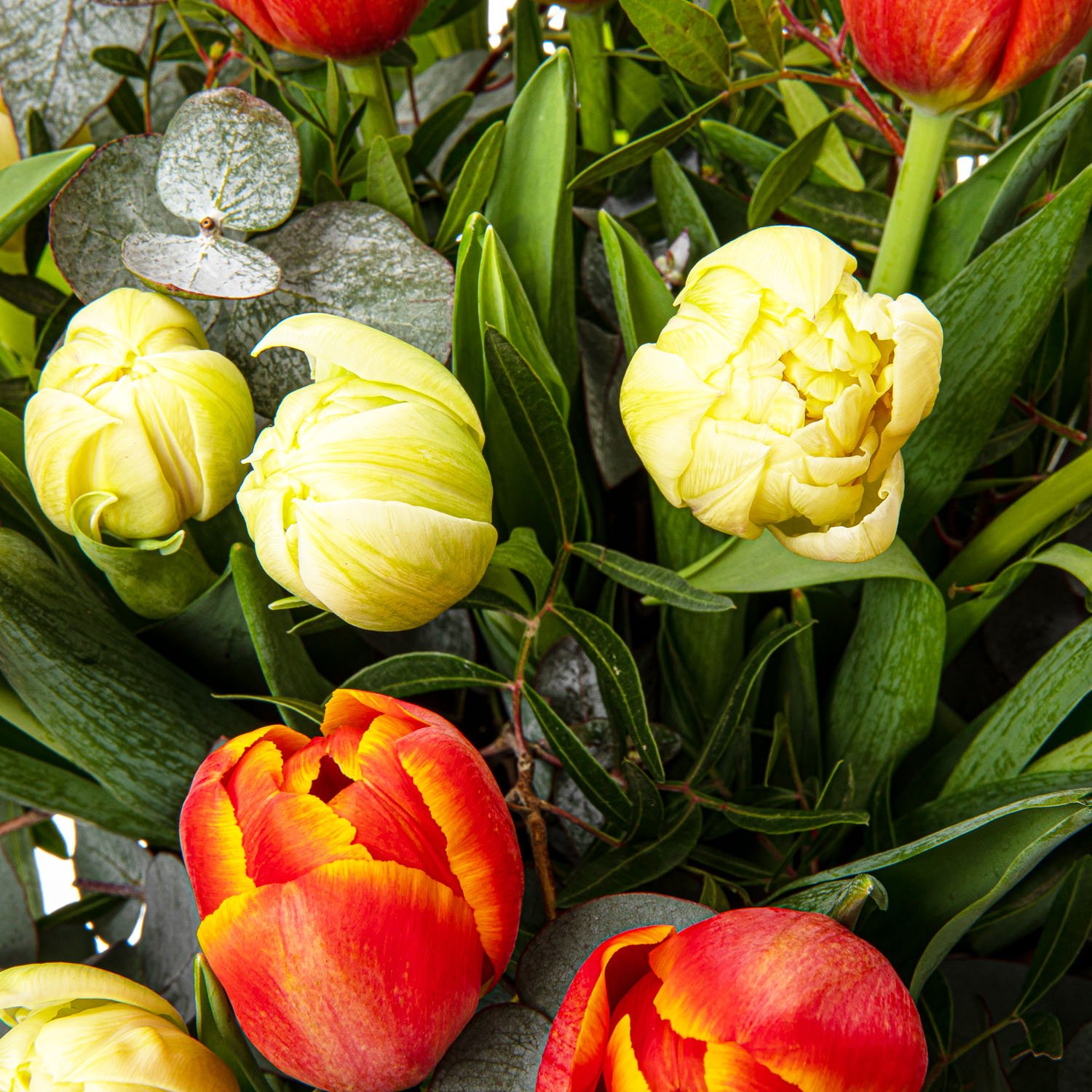 | Standardní | 8 ks tulipán oranžový, 7 ks tulipán bílý, eucalyptus a dekorativní zeleň (sala) |