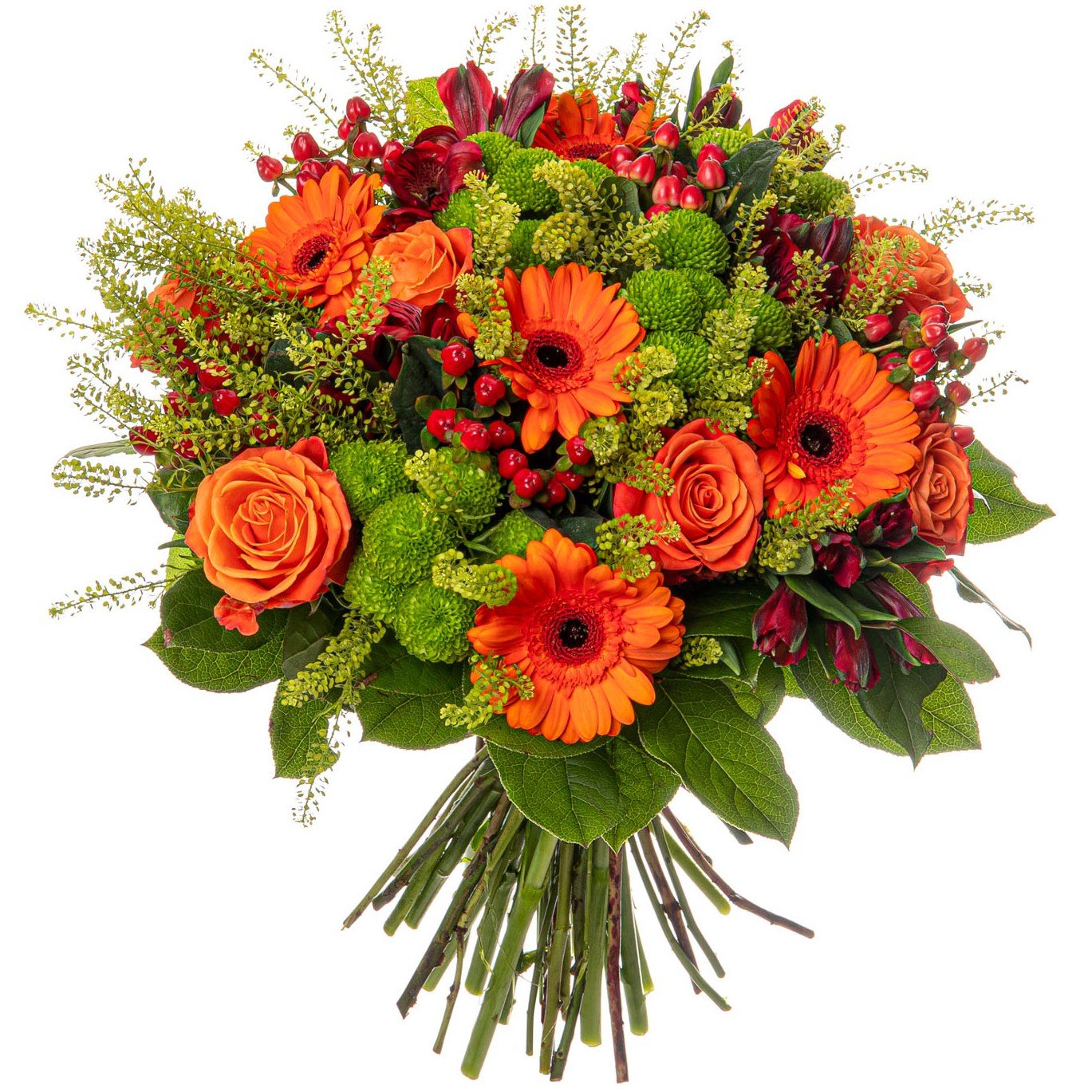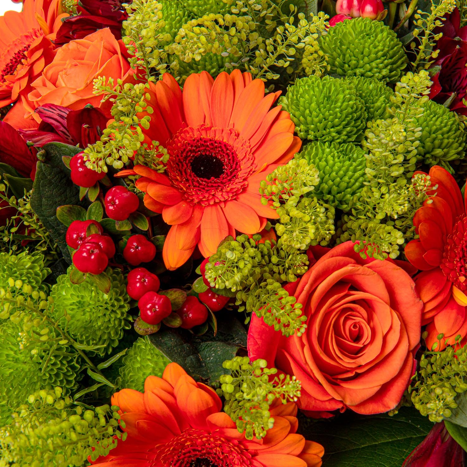 | Exkluzivní | 5 ks gerbera mini oranžová, 4 ks santini, 5 ks alstromerie červená, 7 ks růže oranžová, 5 ks hypericum a dekorativní zeleň (pistacie, salal) |