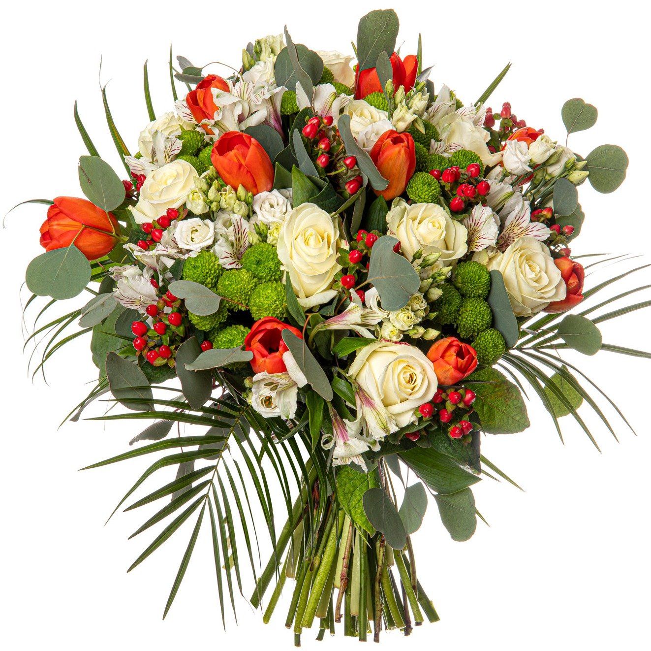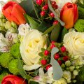 | Exkluzivní | 9 ks růže bílá, 7 ks alstromerie bílá, 10 ks hypericum, 7 ks santini, 10 ks tulipán červený, 5 ks eustoma, eucalyptus a dekorativní zeleň (pistacie, chico) |