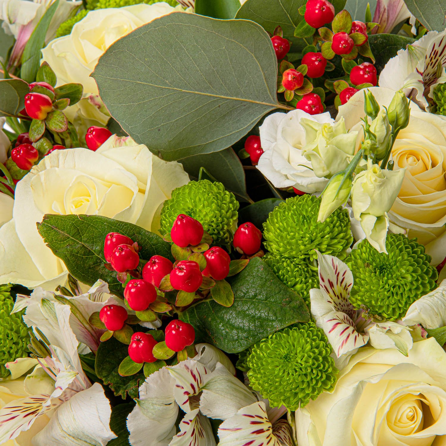 | Exkluzivní | 9 ks růže bílá, 7 ks alstromerie bílá, 10 ks hypericum, 7 ks santini, 5 ks eustoma, eucalyptus a dekorativní zeleň (pistacie, chico) |