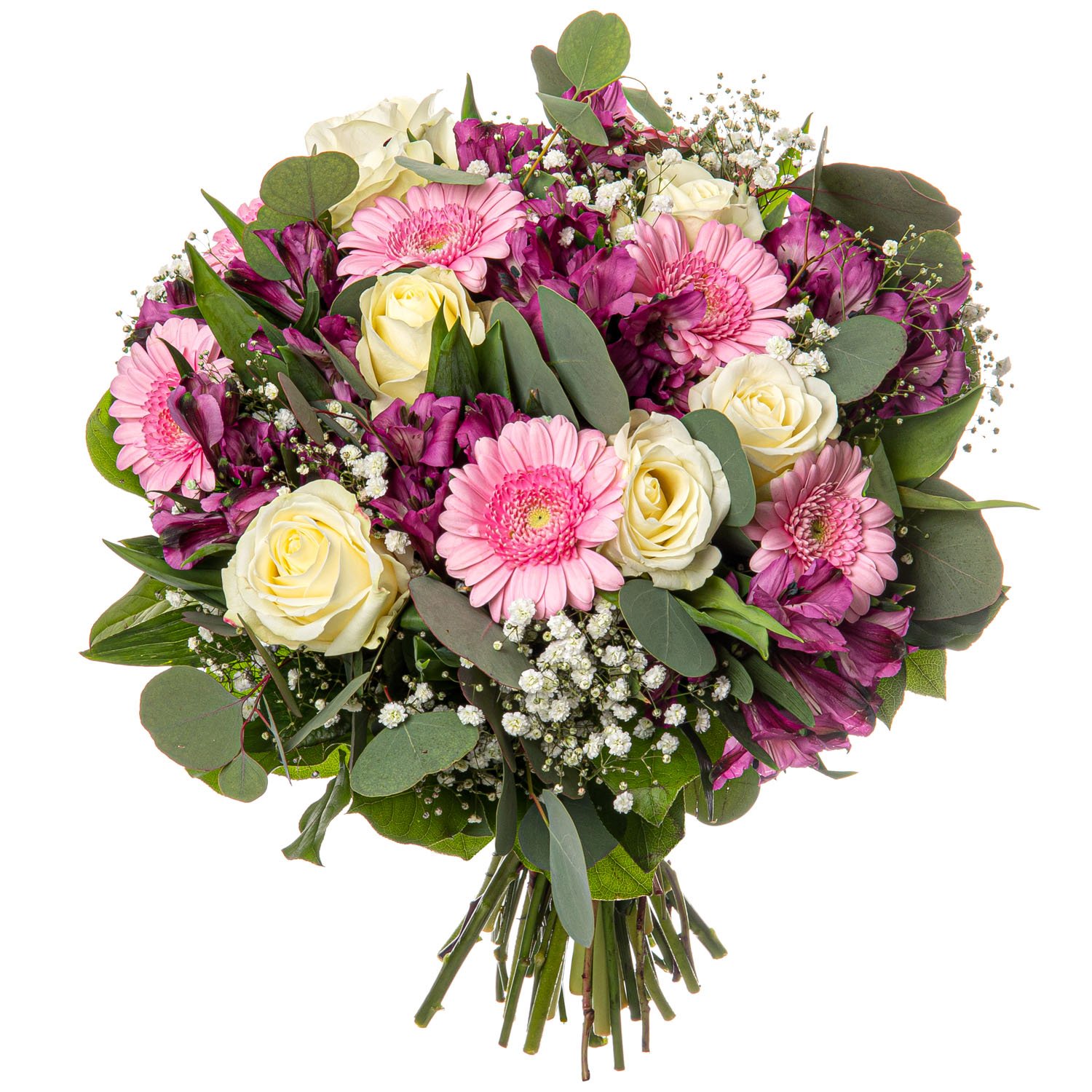 | Velká | 5 ks růže, 5 ks gerbera mini, 5 ks alstromerie růžová/fialová, 4 ks gypsophila, eucalyptus a dekorativní zeleň (pistacie, salal) |