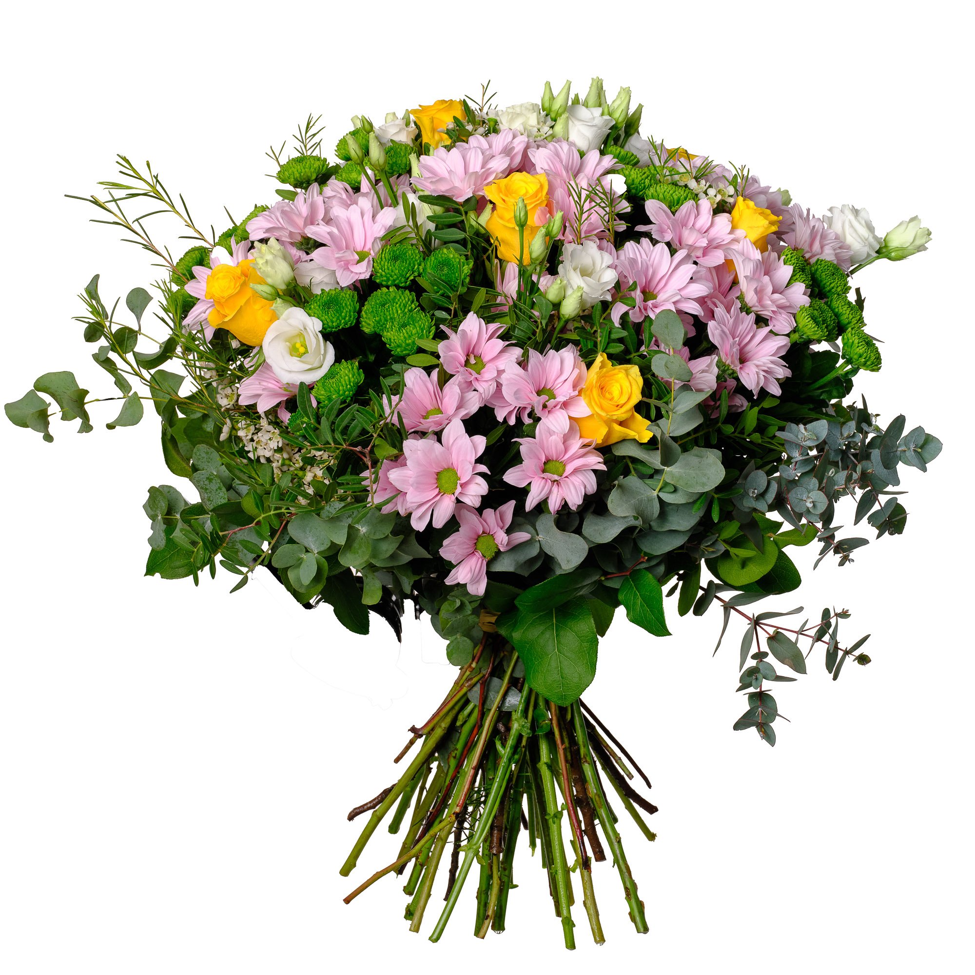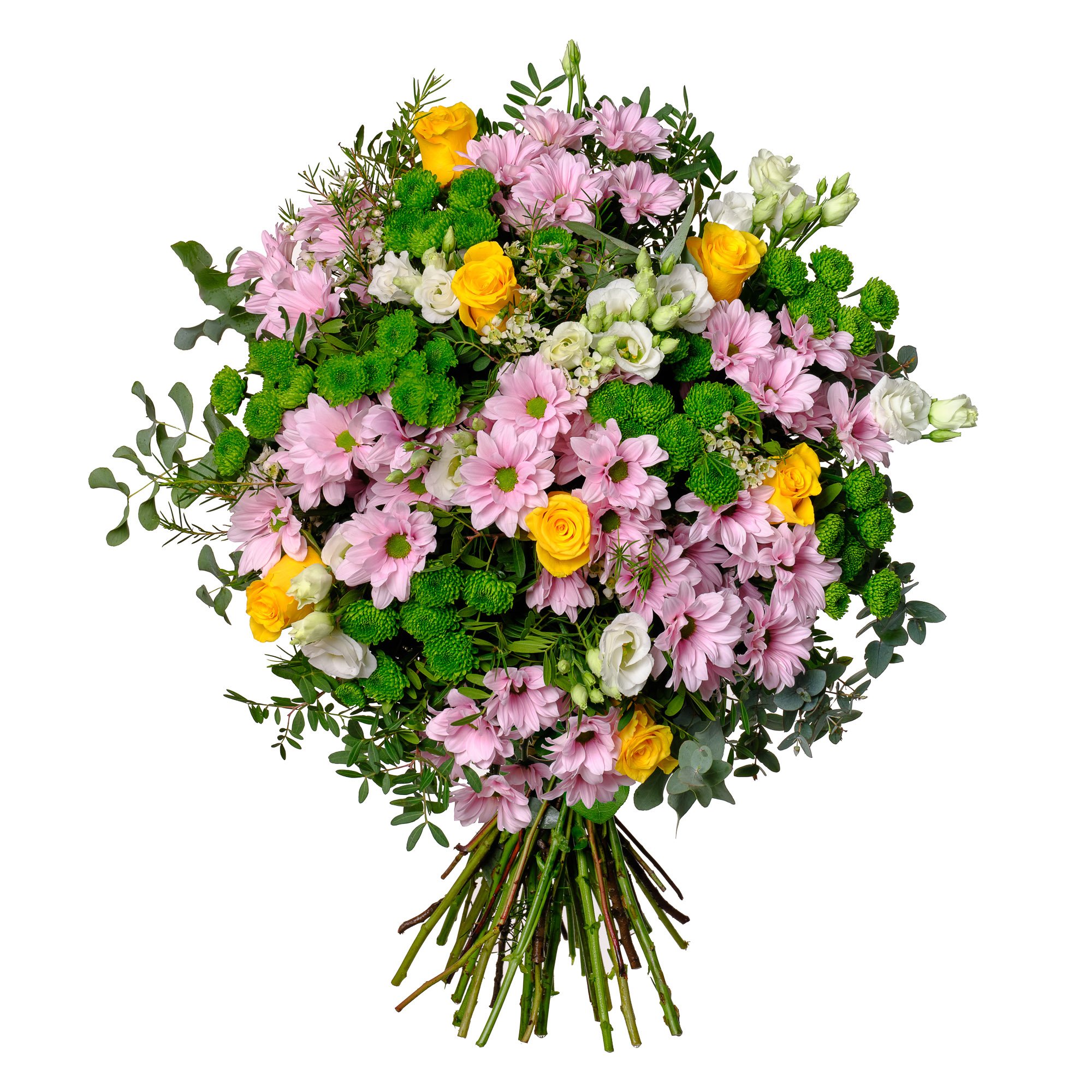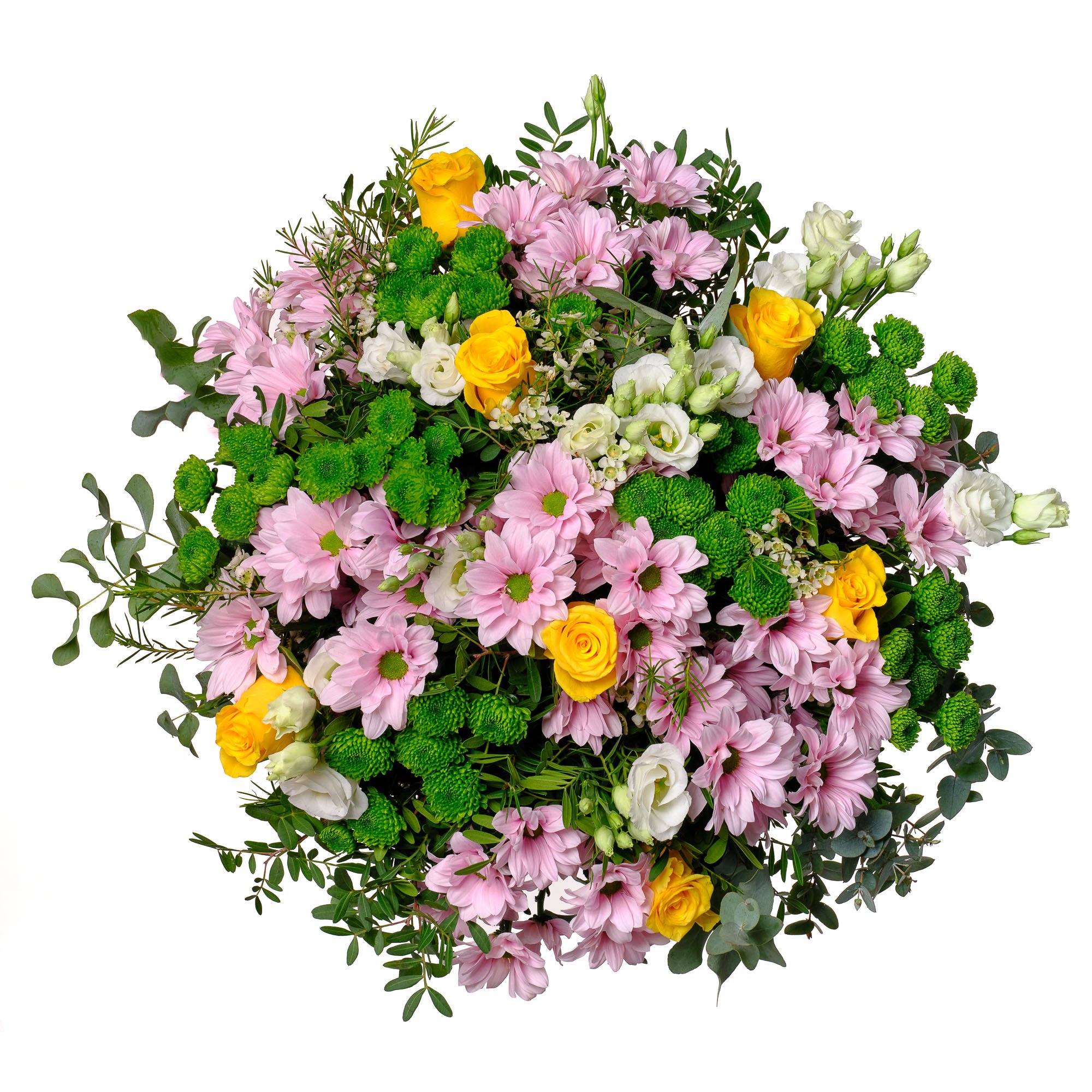 | Standardní | 3 ks růže, 3 ks santini, 3 ks chrysantéma, 2 ks eustoma, 2 ks waxflower a dekorativní zeleň (pistacie, salal, eukalyptus) |